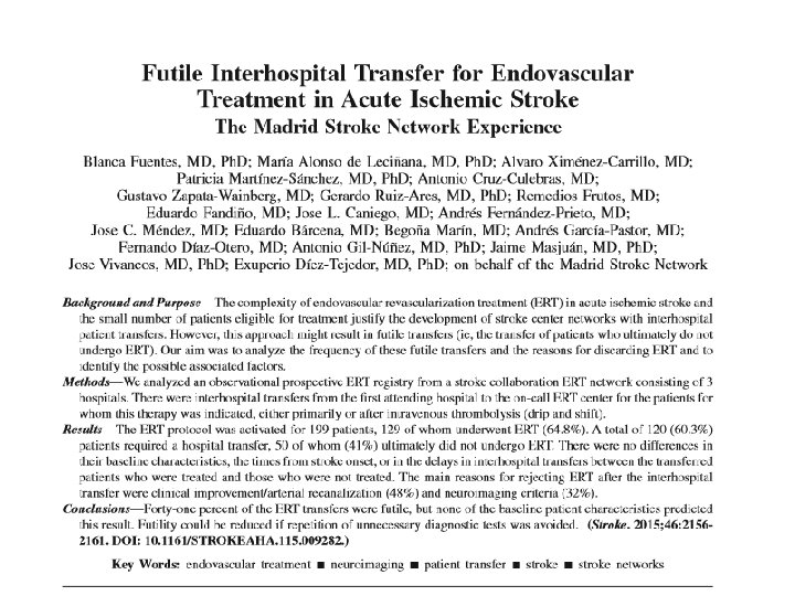 Transfer related Morbidity/Mortality • In IMS III, the odds of a good clinical outcome (modified Rankin Scale score ≤ 2) for subjects treated under the drip and ship paradigm are less than the odds for subjects treated under the mother-ship paradigm (odds ratio, 0. 56; 95% confidence interval, 0. 31– 0. 99; P=0. 045). Goyal et al. Circulation 2014 • Hospital transfer associated with increased mortality Rinaldo et al JNIS 2016