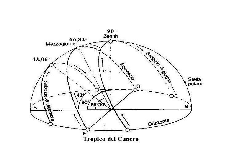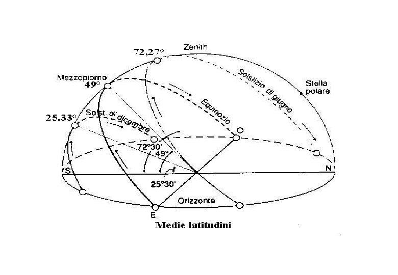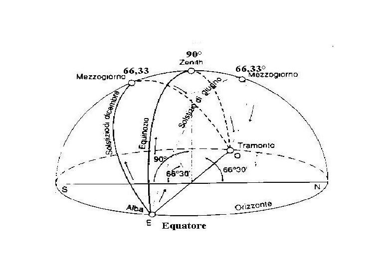Amplitudine AMPLITUDINE ORTIVA AMPLITUDINE OCCIDUA Rappresentazione della posizione dei punti cardinali sul piano dell’orizzonte e delle variazioni stagionali dell’est (amplitudine ortiva) e dell’ovest (amplitudine occidua) in conseguenza del cammino apparente del sole sul piano dell’orizzonte nei momenti caratteristici dell’anno in una località di 30° di latitudine