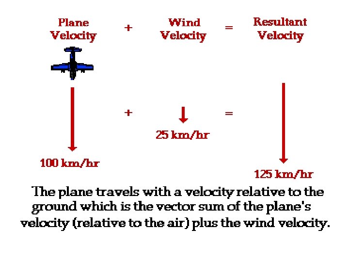 Now… • Suppose a plane traveling with a velocity of 100 km/hr with respect to the air meets a headwind with a velocity of 25 km/hr. In this case, the resultant velocity would be 75 km/hr.