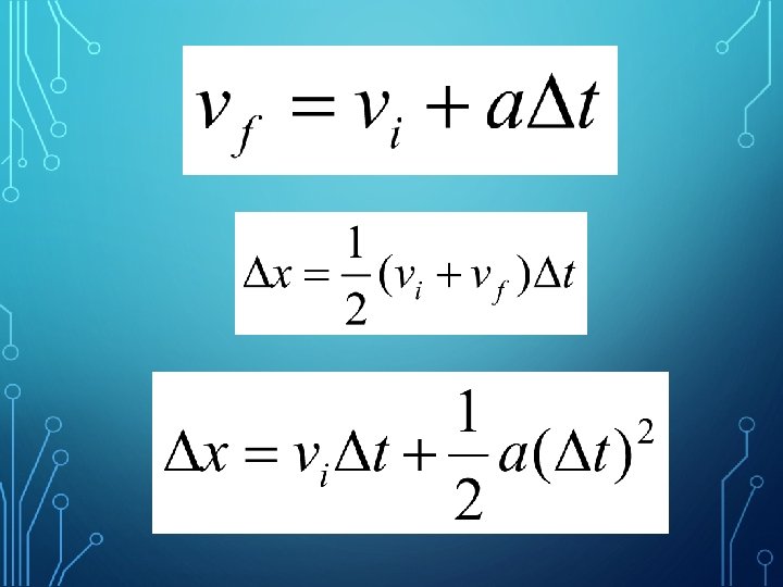 MOTION WITH CONSTANT ACCELERATION • Velocity changes at a constant rate • What does displacement really depend on? • • • Acceleration Initial Velocity Time