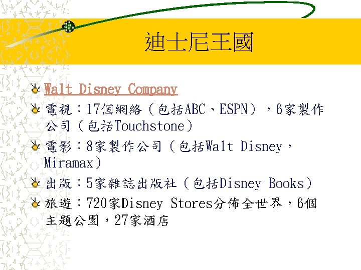 Media Networks 媒體網絡 Its Media Networks unit is centered around the American Broadcasting Company (ABC) television network, which it acquired through a merger with Capital Cities/ABC in 1996. Properties include: Walt Disney Television Touchstone Television ABC Entertainment ABC Television Network Buena Vista Television ESPN SOAPnet Lifetime