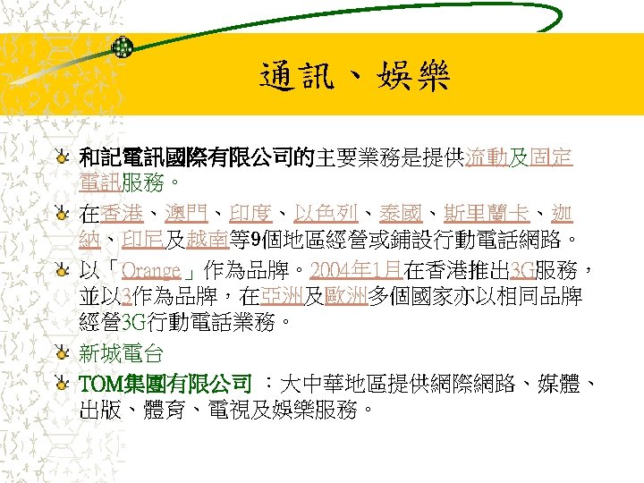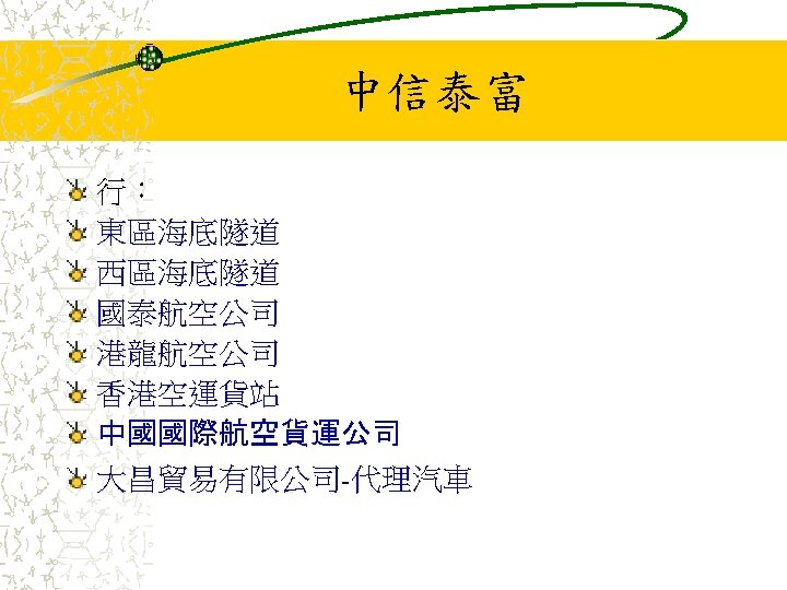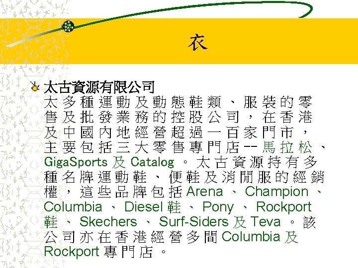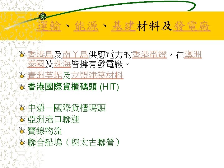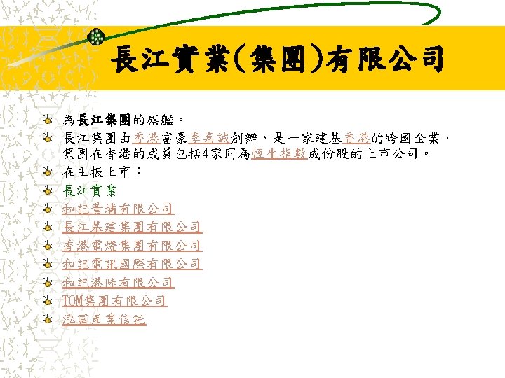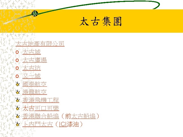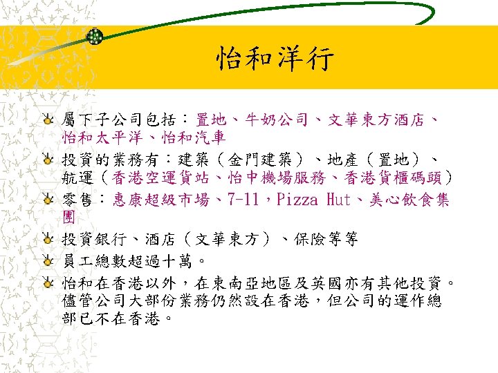 其他業務 Jardine Pacific Colliers Halifax Gammon Construction Hong Kong Air Cargo Terminals Limited (Hactl) Jardine Aviation Services Jardine Airport Services Limited (JASL) Jardine Air Terminal Services (JATS) Jardine Engineering Corporation 香港置地(Hongkong Land Holdings Limited) Mandarin Oriental International Limited Jardine Cycle & Carriage Jardine One. Solution Jardine Property Investment Ltd Jardine Restaurant Group (JRG) Pizza Hut Jardine Schindler Jardine Shipping Services (JSS) Jardine Travel Group Jardine Motors Group Zung Fu Company Limited Jardine Lloyd Thompson group of companies (JLT) Jardine Strategic Rothschilds Continuation Holdings AG (RCH)