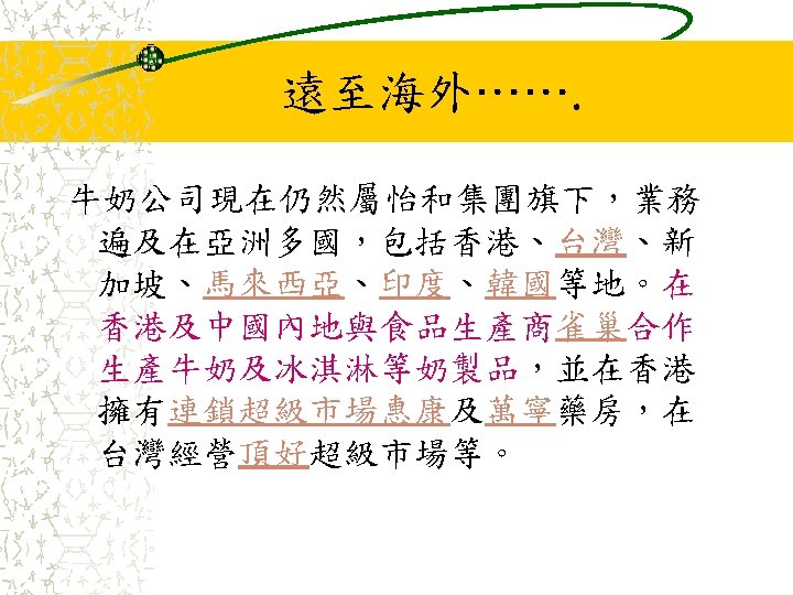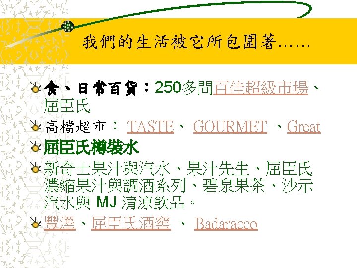 與我們生活息息相關的有: 牛奶國際(Dairy Farm International Holdings Limited) 惠康(Wellcome)、Cold Storage、Giant、Shop N Save、Hero、Foodworld 萬寧(Mannings)、Guardian、Health and Glow、Olive Young 7 -11(7 -Eleven)、Starmart 宜家傢俬(IKEA) 美心食品(Maxim's) Pizza Hut (Jardine Restaurant Group (JRG) )