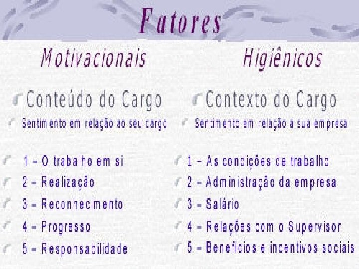 Os Fatores Motivadores, segundo Maslow Tipos de Necessidades Secundárias Auto Realização Estima Primárias Social Segurança Fisiológicas O desejo dos indivíduos de renovar e reciclar seu potencial; tornar-se cada vez mais o que cada um seria capaz de ser. O sentimento das pessoas de sentirem-se valorizadas pelos que as rodeiam; sua auto-estima; o desejo de sentir-se importante, competente e valorizado. A necessidade endógena de amar e ser amado, ter amizade, vínculos familiares, intimidade etc. A contrapartida da insegurança natural das pessoas; estabilidade, proteção, livre do perigo; um abrigo; uma estrutura, uma ordem etc. São necessidades físicas como; sexo, bebida, comida sono etc.