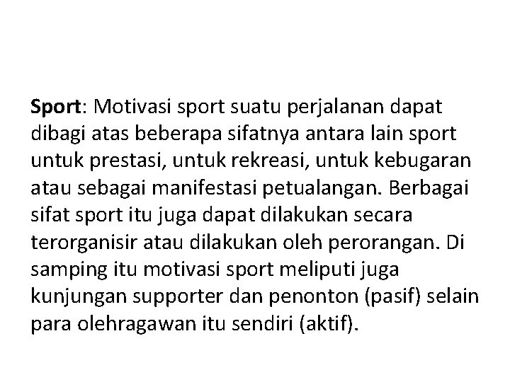 Sport: Motivasi sport suatu perjalanan dapat dibagi atas beberapa sifatnya antara lain sport untuk prestasi, untuk rekreasi, untuk kebugaran atau sebagai manifestasi petualangan. Berbagai sifat sport itu juga dapat dilakukan secara terorganisir atau dilakukan oleh perorangan. Di samping itu motivasi sport meliputi juga kunjungan supporter dan penonton (pasif) selain para olehragawan itu sendiri (aktif).