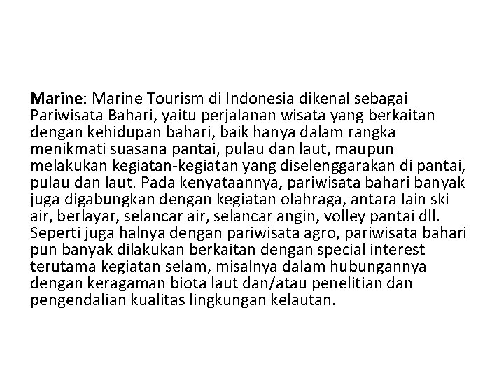 Marine: Marine Tourism di Indonesia dikenal sebagai Pariwisata Bahari, yaitu perjalanan wisata yang berkaitan dengan kehidupan bahari, baik hanya dalam rangka menikmati suasana pantai, pulau dan laut, maupun melakukan kegiatan-kegiatan yang diselenggarakan di pantai, pulau dan laut. Pada kenyataannya, pariwisata bahari banyak juga digabungkan dengan kegiatan olahraga, antara lain ski air, berlayar, selancar air, selancar angin, volley pantai dll. Seperti juga halnya dengan pariwisata agro, pariwisata bahari pun banyak dilakukan berkaitan dengan special interest terutama kegiatan selam, misalnya dalam hubungannya dengan keragaman biota laut dan/atau penelitian dan pengendalian kualitas lingkungan kelautan.