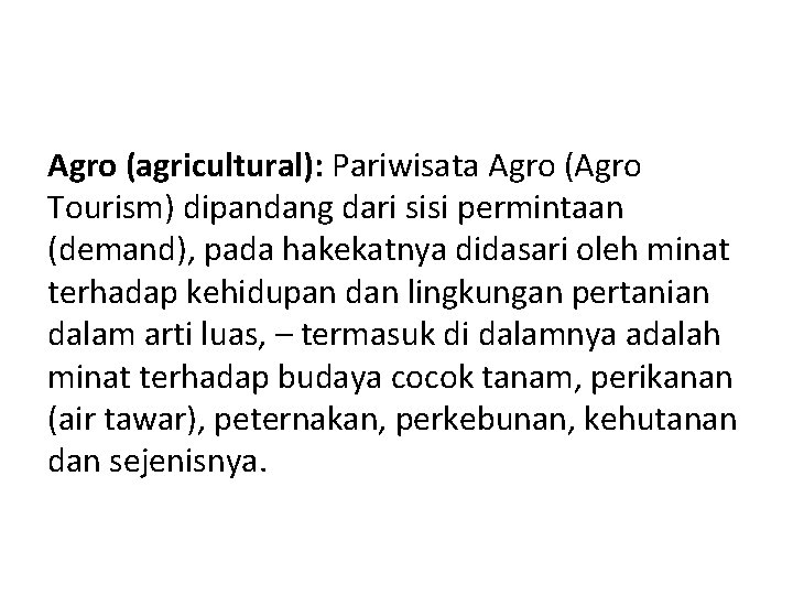 Agro (agricultural): Pariwisata Agro (Agro Tourism) dipandang dari sisi permintaan (demand), pada hakekatnya didasari oleh minat terhadap kehidupan dan lingkungan pertanian dalam arti luas, – termasuk di dalamnya adalah minat terhadap budaya cocok tanam, perikanan (air tawar), peternakan, perkebunan, kehutanan dan sejenisnya.