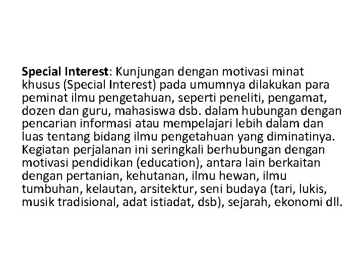 Special Interest: Kunjungan dengan motivasi minat khusus (Special Interest) pada umumnya dilakukan para peminat ilmu pengetahuan, seperti peneliti, pengamat, dozen dan guru, mahasiswa dsb. dalam hubungan dengan pencarian informasi atau mempelajari lebih dalam dan luas tentang bidang ilmu pengetahuan yang diminatinya. Kegiatan perjalanan ini seringkali berhubungan dengan motivasi pendidikan (education), antara lain berkaitan dengan pertanian, kehutanan, ilmu hewan, ilmu tumbuhan, kelautan, arsitektur, seni budaya (tari, lukis, musik tradisional, adat istiadat, dsb), sejarah, ekonomi dll.