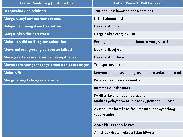 Faktor Pendorong (Push Factors) Faktor Penarik (Pull Factors) Beristirahat dan relaksasi Jaminan keselamatan pada destinasi Mengunjungi tempat-tempat baru Lokasi akomodasi Belajar dan mengalami hal-hal baru Daya tarik ilmiah Menjauhkan diri dari stress Harga paket yang inklusif Melarikan diri dari kegitan sehari-hari Berbagai makanan dan minuman yang sesuai Menemui orang-orang dan bersosialisasi Daya tarik sejarah Meningkatkan kesehatan dan kesejahteraan Daya tarik budaya Mencoba tantangan/pengalaman dan petualangan Transportasi lokal Melatih fisik Kenyamanan urusan imigrasi dan prosedur bea cukai Mengunjungi keluarga dan teman Ketersediaan fasilitas medis Infrastruktur destinasi Kualitas layanan agen pelayanan Kualitas pelayanan tour leader , pemandu wisata Aksesbilitas hotel dan fasilitas untuk penyandang cacat/senior Acara khusus dan festival Aktivitas wisata, rekreasi dan hiburan