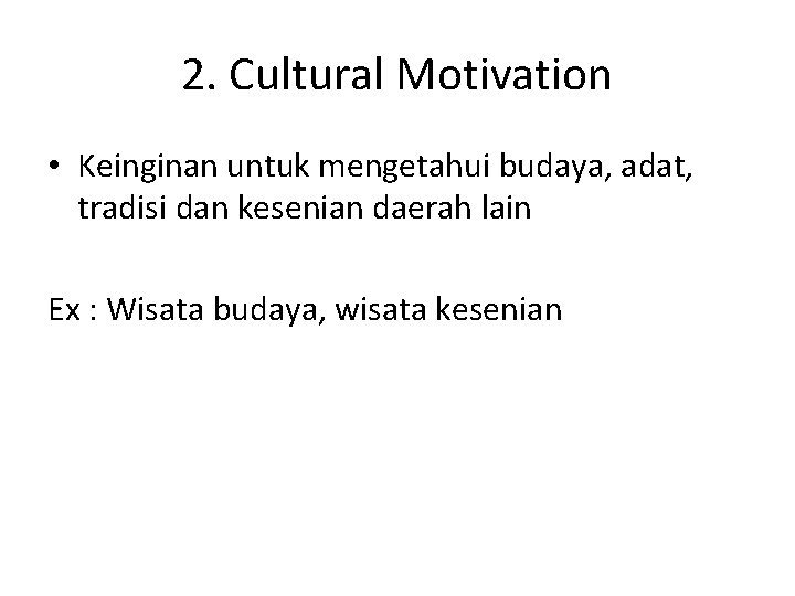 2. Cultural Motivation • Keinginan untuk mengetahui budaya, adat, tradisi dan kesenian daerah lain Ex : Wisata budaya, wisata kesenian