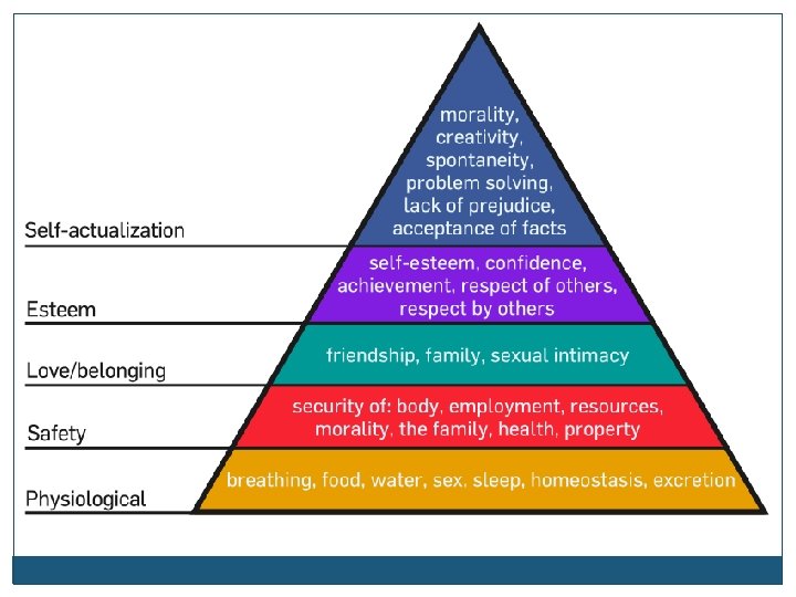 Theories: Maslow’s Hierarchy Abraham Maslow (1908 -1970) Humanistic psychologist who developed the hierarchy of needs, stating that some needs take priority over others Begins at the base with physiological needs, and then proceeds through safety needs to psychological needs Higher-level needs won’t become active until lower-level needs have been satisfied