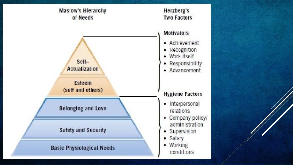 Herzberg’s Theory Herzberg's motivation theory is one of the content theories of motivation. These attempt to explain the factors that motivate individuals through identifying and satisfying their individual needs, desires and the aims pursued to satisfy these desires. This theory of motivation is known as a two-factor content theory. Two-factor theory distinguishes between: Herzberg had close links with Maslow and believed in a two-factor theory of motivation. He argued that there were certain factors that a business could introduce that would directly motivate employees to work harder motivators. However, there were also factors that would de-motivate an employee if not present but would not in themselves actually motivate employees to work harder hygiene factors. Herzberg’s Motivating and Hygiene Factors Motivating Factors: Hygiene Factors: Achievement Company policy Recognition Supervision Work itself Working conditions Responsibility Interpersonal relationship at work Advancement Salary & benefits Growth. Job security.