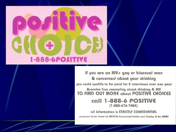 Conclusions, Concerns and Lessons Learned from Positive Choices Empirical conclusions: • • The intervention reduced days of heavy drinking and unsafe sex. • Particularly critical for a heavy drinking sample in which there is a connection between the behaviors The intervention reduced overall drinking. • Supports many previous findings in this area