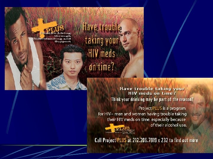 Study Description Project PLUS was aimed at simultaneously improving adherence to HIV meds and reducing drinking among heavy drinking HIV+ men and women in NYC.