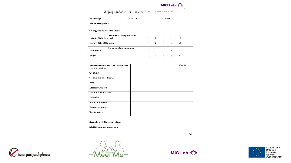 Syfte Incitament för energieffektivisering • Utveckla kommunikationskunskaper för samtal med SMF – Information och rådgivning – Hitta företagarens egna incitament – Stimulera systematiskt arbete med energifrågor • Grundkurs i Motiverande Samtal – ambassadörer för kollegor Om oss • Hans Wickström, psykolog och jägmästare Meet. Me Psykologkonsult AB www. meetmeab. se | hans. wickstrom@kbtanalys. se | 0760 -457500 • Lars Forsberg, psykolog och Med dr/Ph D MIC Lab AB www. miclab. se | lars. forsberg@miclab. se | 0736 -923050