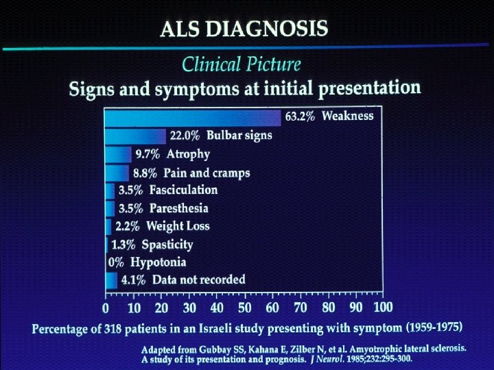 ALS: Laboratory Studies n n n CK levels are typically normal but may be increased 2 -3 x normal in almost half of patients. * CSF may show mild protein elevation (less than 100 mg/dl). * All other laboratory studies should be normal.