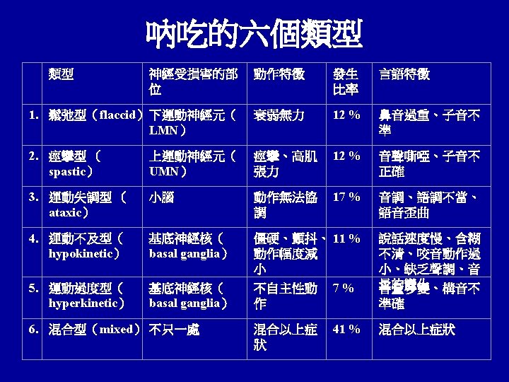 與吶吃有關的神經性疾患 • • • 退化性疾病(degenerative disease) 腦血管性疾病(vascular disorders) 腦創傷性(traumatic) 腫瘤(tumor) 發炎性疾病(inflammatory)、感染性疾病( infectious disease) 毒性代謝異常(Toxic-Metabolic conditions) 髓鞘脫失疾病(dymyelinating disease) 腦神經病變(neuropathies) 肌肉疾病 解剖結構畸形(Anatomic anomalies) 其他未知病因