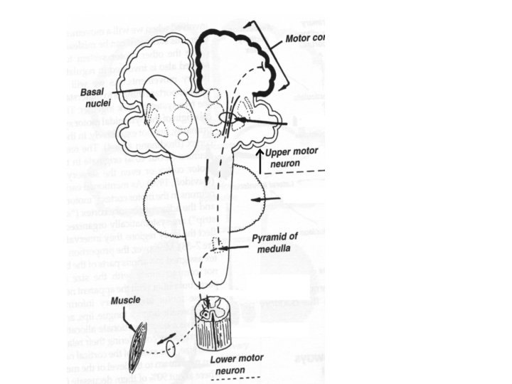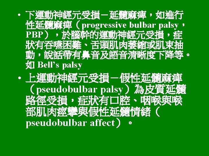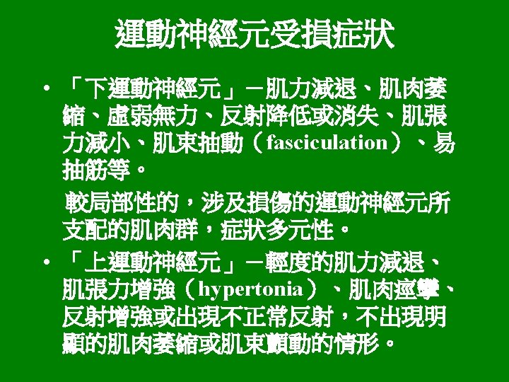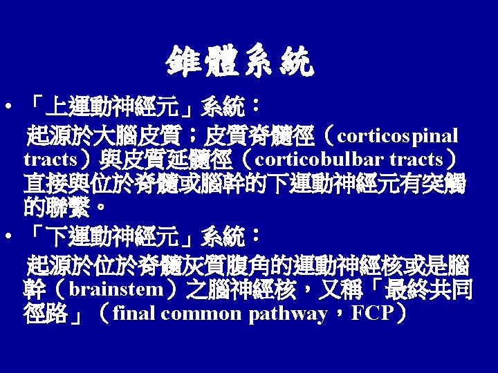 運動神經系統 • 錐體系統(pyramidal system):direct activation pathway: Ø 皮質脊髓徑(corticospinal tracts) Ø 皮質延髓徑(corticobulbar tracts) • 錐體外系統(extrapyramidal