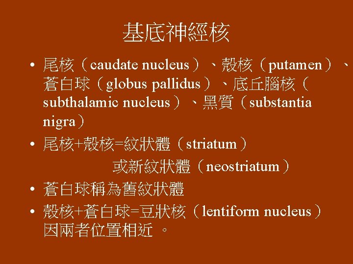 運動神經系統 • 錐體系統(pyramidal system):direct activation pathway: Ø 皮質脊髓徑(corticospinal tracts) Ø 皮質延髓徑(corticobulbar tracts) • 錐體外系統(extrapyramidal system): indirect activation pathway、基底神經核( basal ganglia ) 、小腦