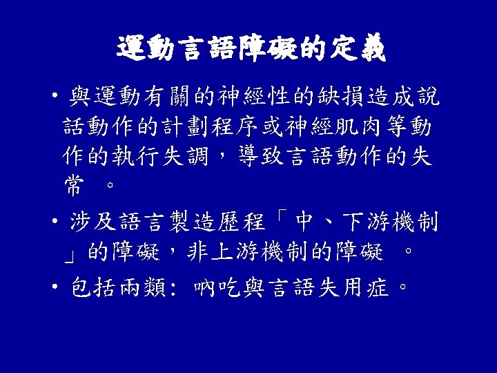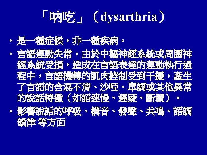 與吶吃有關的神經性疾患 • • • 退化性疾病(degenerative disease) 腦血管性疾病(vascular disorders) 腦創傷性(traumatic) 腫瘤(tumor) 發炎性疾病(inflammatory)、感染性疾病( infectious disease) 毒性代謝異常(Toxic-Metabolic
