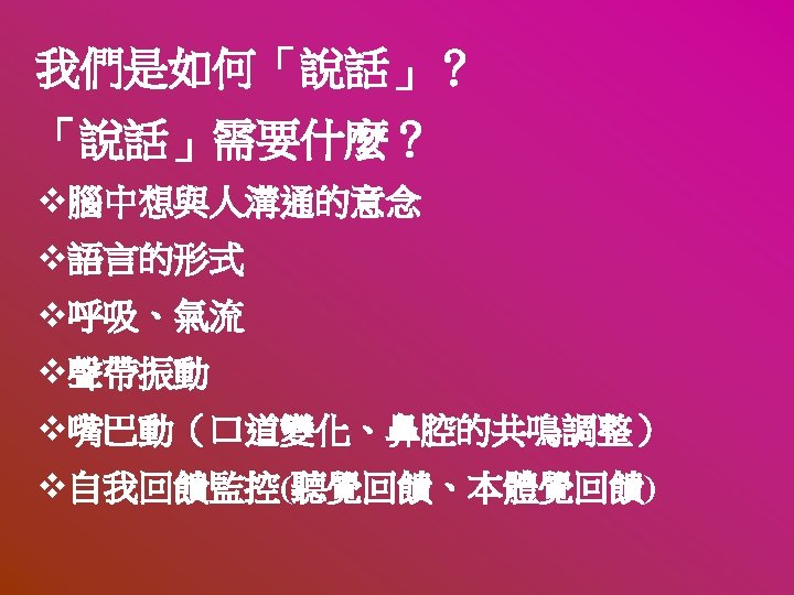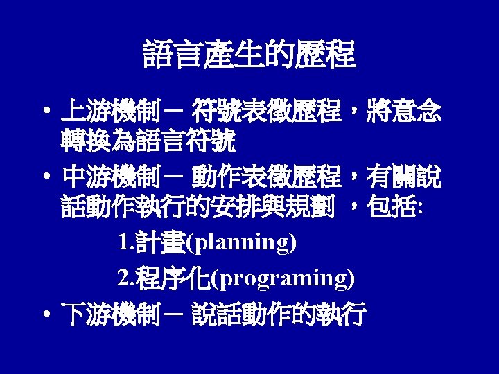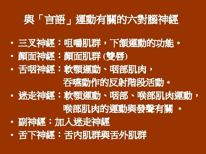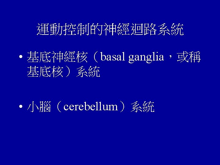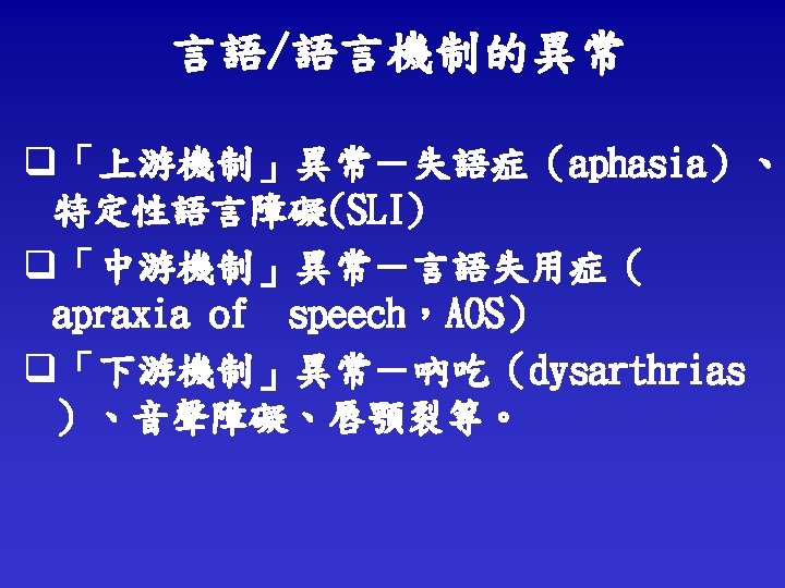 Motor Speech Disorders Disorders of speech resulting from Slides: 25 Download presentation Motor Speech Disorders ‘’ Disorders of speech resulting from neurologic impairment affecting the motor programming or neuromuscular execution of speech. They encompass apraxia of speech and the dysarthrias. ’’( Duffy,1995) 吶吃分類 • 成人(acquired) :因疾病或意外造成 • 發展性(developmental) :先天性 (congenital) ,如Cerebral Palsy 運動神經系統 • 錐體系統(pyramidal system):direct activation pathway: Ø 皮質脊髓徑(corticospinal tracts) Ø 皮質延髓徑(corticobulbar tracts) • 錐體外系統(extrapyramidal system): indirect activation pathway、基底神經核( basal ganglia ) 、小腦 與吶吃有關的神經性疾患 • • • 退化性疾病(degenerative disease) 腦血管性疾病(vascular disorders) 腦創傷性(traumatic) 腫瘤(tumor) 發炎性疾病(inflammatory)、感染性疾病( infectious disease) 毒性代謝異常(Toxic-Metabolic conditions) 髓鞘脫失疾病(dymyelinating disease) 腦神經病變(neuropathies) 肌肉疾病 解剖結構畸形(Anatomic anomalies) 其他未知病因 退化性疾病(degenerative disease) • • Parkinson’s disease Friedreich’s ataxia Huntington’s disease Amyotrophic lateral sclerosis Multiple sclerosis Progressive supranuclear palsy Wilson’s disease Olivopontocerebellar degeneration 非進行性疾患 (nonprogressive disorders) • Cerebrovascular accident (CVA), Storke • Traumatic brain injury (TBI)