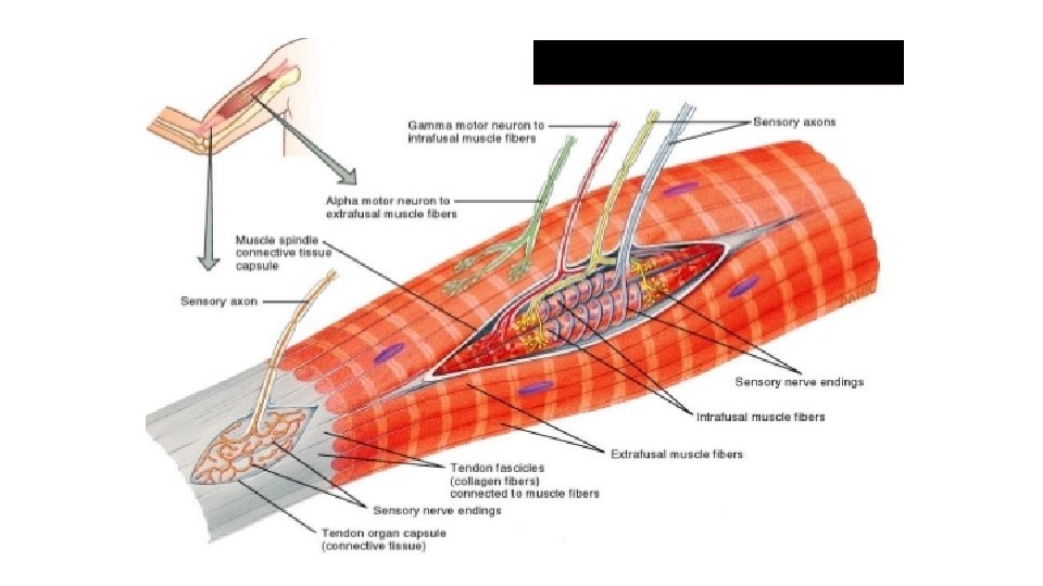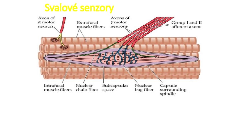 Svalové senzory • Svalové vretienka (Ia) –intrafuzálene vlákna – paralelný komponent • citlivé na statické ako aj dynamické zmeny dĺžky sval – na natiahnutie! • Golgiho šľachové teliesko (Ib) –sériovo zapojené s extrafuzálnzmi vláknami - sú citlivé na napätie v šľache – pri kontrahovanom svale! • Paciniho telieska (II) – roztrúsene po svale - reagujú na vibrácie • Voľné nervové zakončenia (III, IV) – detekujú bolesť