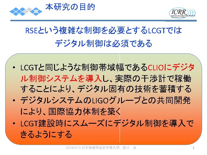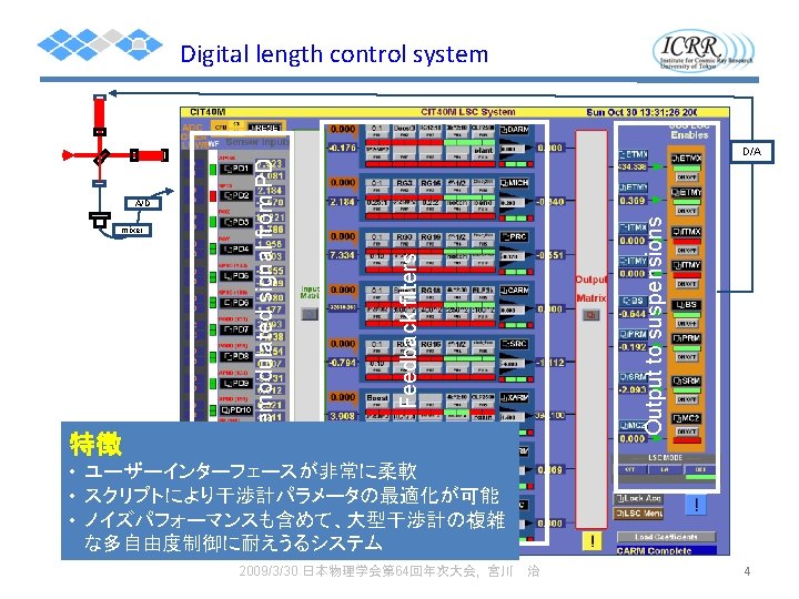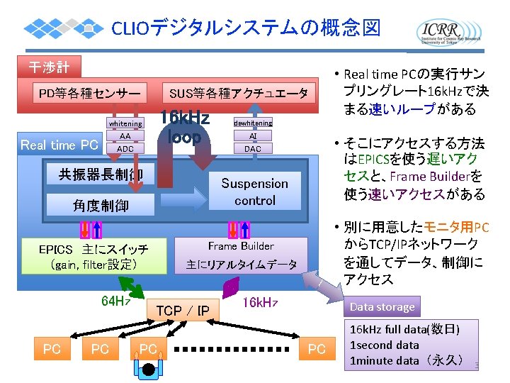 CLIO digital block diagram: 1 st stage Operation PC General linux for operation, monitor GPS timing slave Real time front end timing card Real time PC LSC 6 ch timing master IOO 4 ch Expansion chassis timing card 16 k. Hz 32 ch ADCx 1 16 k. Hz 16 ch DACx 1 I/O Bx 1 whitening filter AA filter AI filter dewhitening filter 2009/9/10 日本物理学会秋期大会, 宮川 PEM 4 ch 治 coil driver 4 ch
