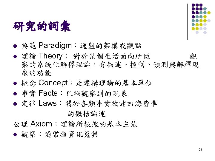 研究的詞彙 • 假設 (Hypothesis) • 假定 (Assumption) • 研究方法 (Methodology) • 限制 (Limitation) • 理論 (Theory) • 概念 (Concept) 22