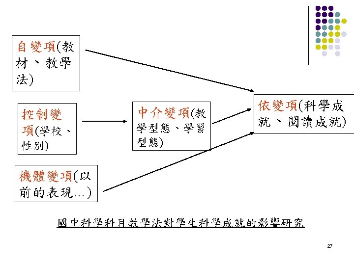 變項 (Variable)的分類 l l 自變項 Independent Variable (predictor variable, experimental variable): This variable determines, influences, or produces the change in the other main factor. 依變項 Dependent Variable: This variable is dependent on or influenced by the independent variable 26