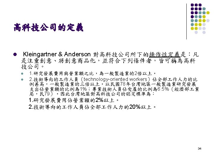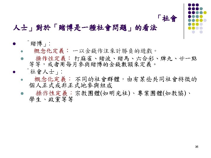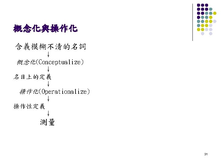 定義的類型 l l 概念性定義 (Formal or Conceptual Definitions) 操作性定義 (Working or Operational Definitions) 30