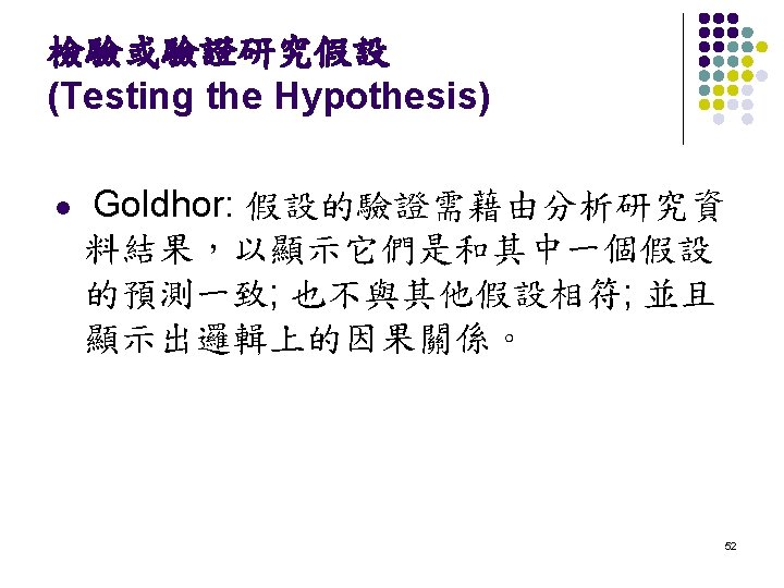 假設應有的特點 (Desirable Characteristics of Hypotheses) l l l Generability, or universality Compatibility with existing knowledge Testability Invariability Causality 51