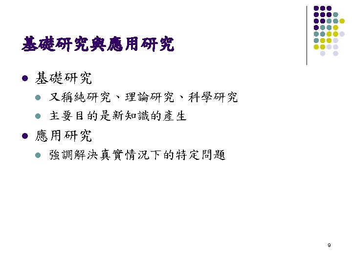 研究的定義 『研究是有計劃且有系統的蒐集、分析以及解釋資料, 以可靠地解決問題的歷程。』(Mouly, 1978) l Research in librarianship is defined as a systematic study of a problem through the application of methodologies or a combination of them, ranging from experimental, descriptive, and quantitative to analytical. l 3