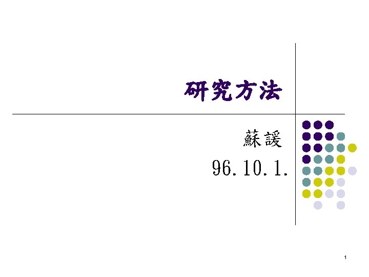 研究的詞彙 l l 操作性定義 (Operational Definition) 信度 (Reliability) 效度 (Validity) 變數,變項 (Variables) l l 質化變項 (Qualitative Variable) 量化變項(Quantitative Variable) 依變項(Dependent Variable) 自變項(Independent Variable) 21