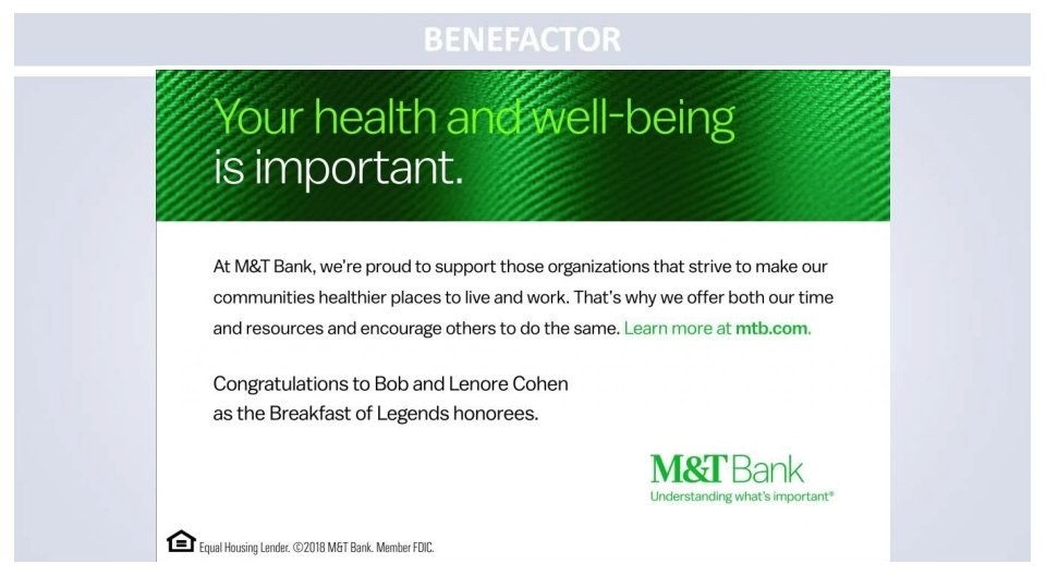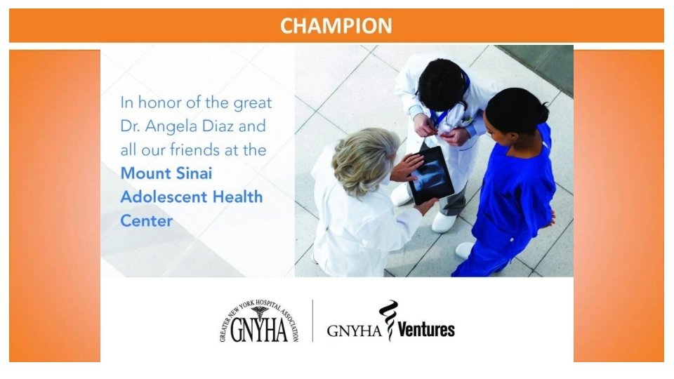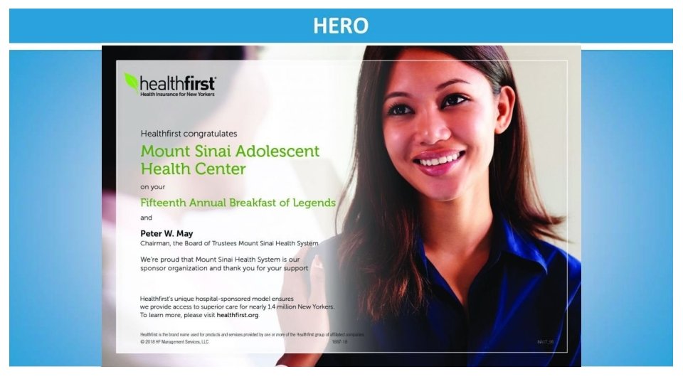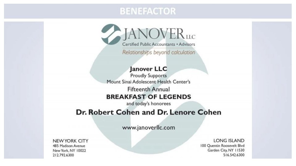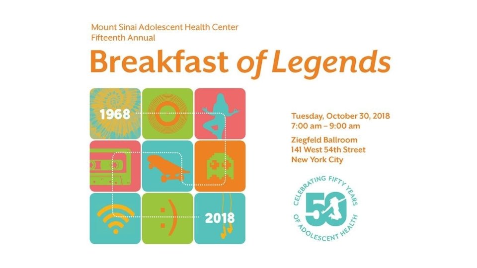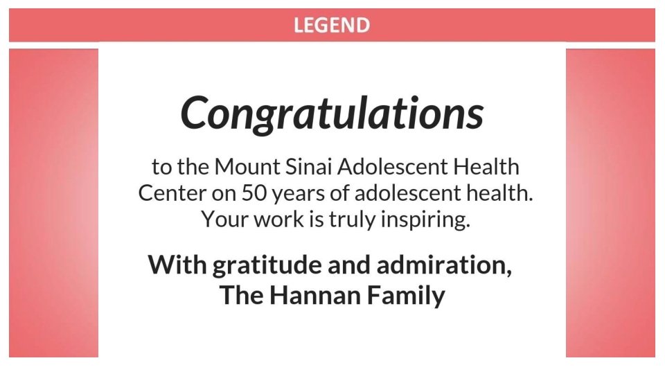 Congratulations to Dr. Angela Diaz and The Mount Sinai Adolescent Health Center on its 50 th Anniversary and the 2018 Legends honorees Gary C. Butts, MD Lenore Katz-Cohen, OD Robert Cohen, OD Peter W. May The Mount Sinai Auxiliary Board Bethany Novak, MS, RN, FNP-BC Courtney Carrera-Ghatan & Saadi Ghatan, MD