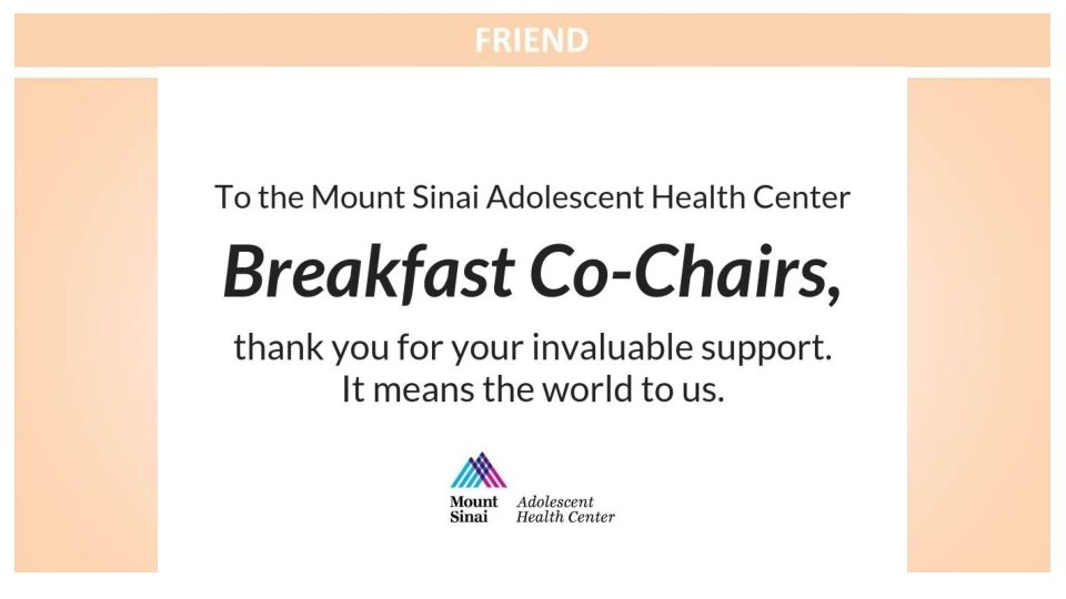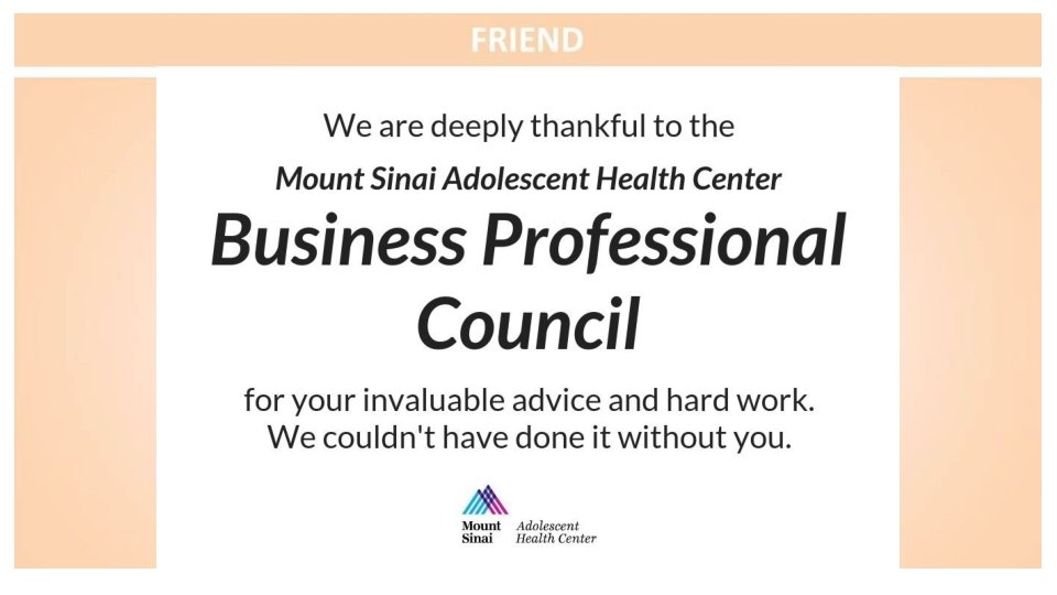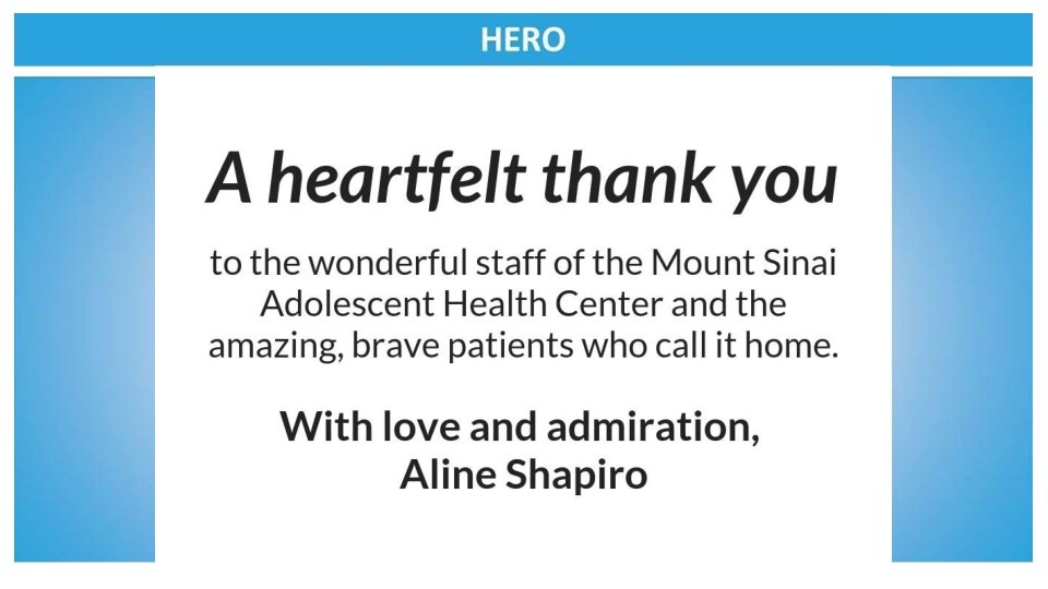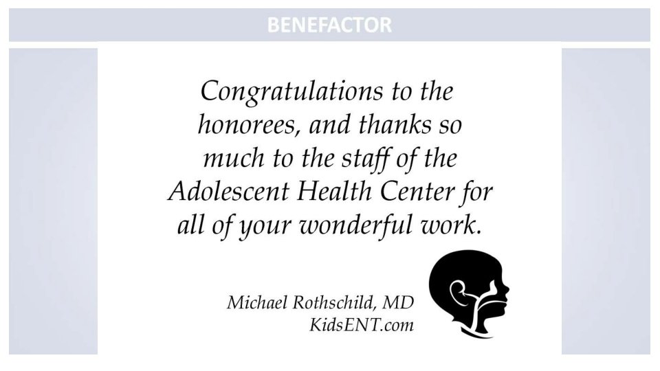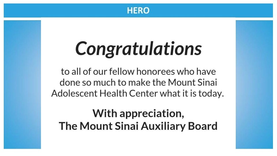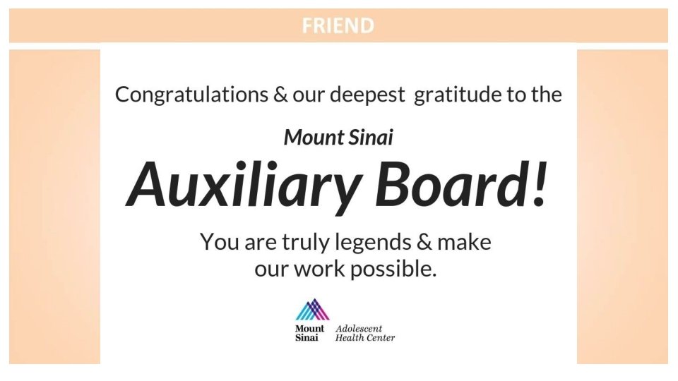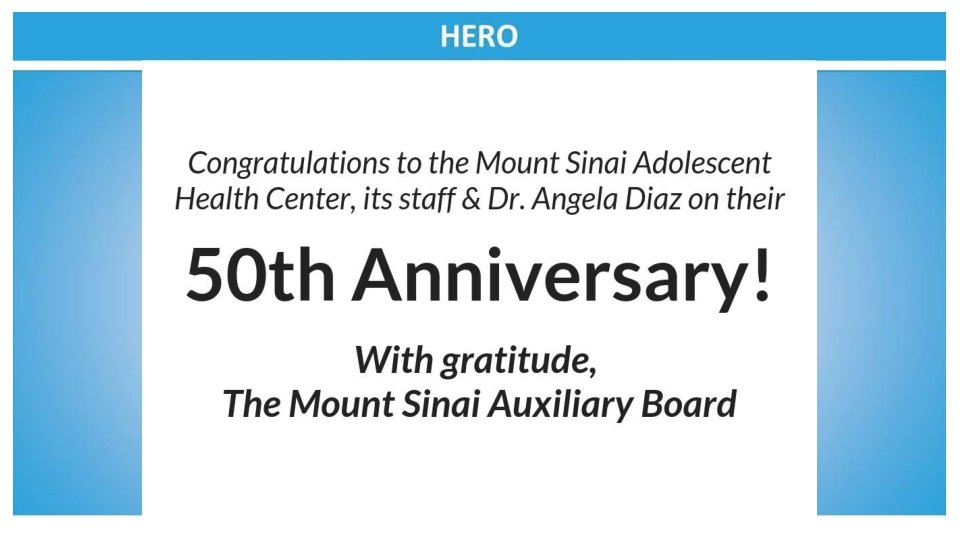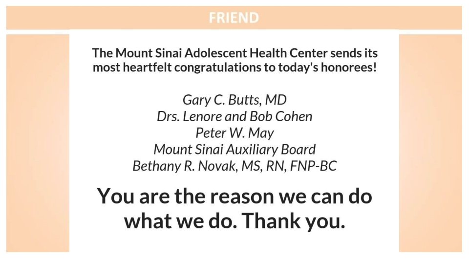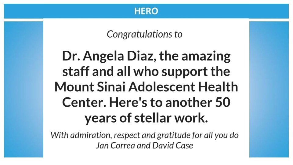 Congratulations to the Mount Sinai Adolescent Health Center on another fabulous year and to the sensational leadership of Dr. Angela Diaz Warmly, The Sacks Family