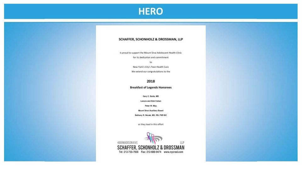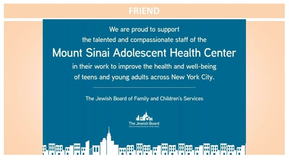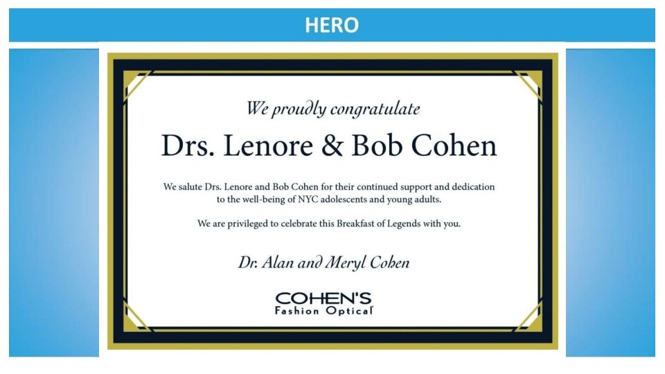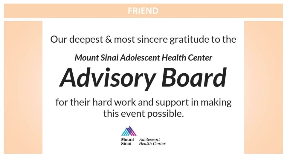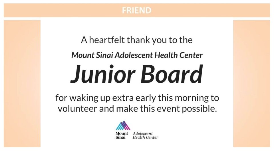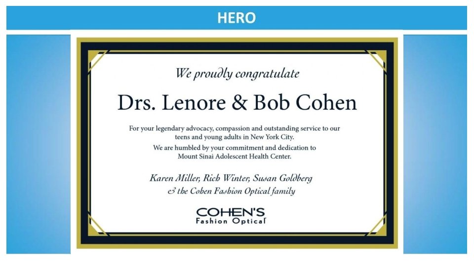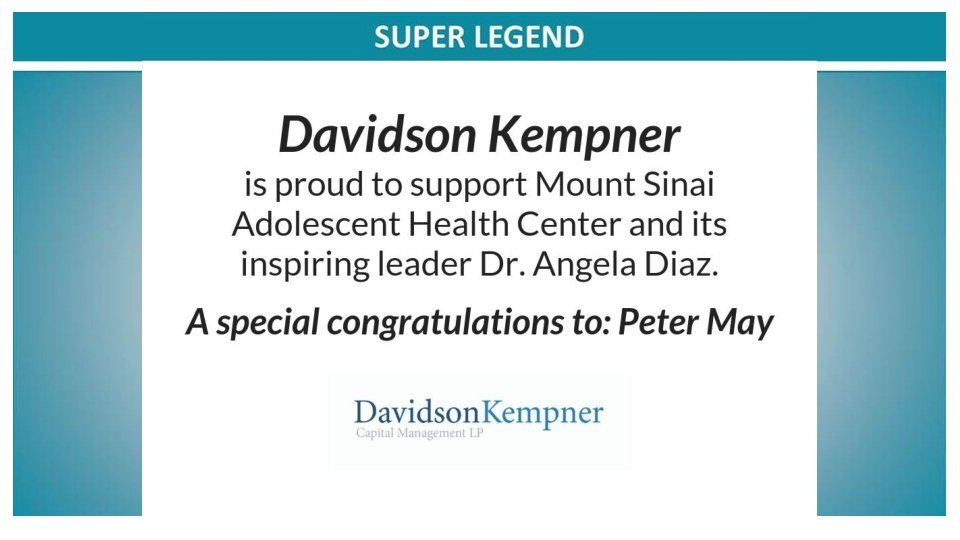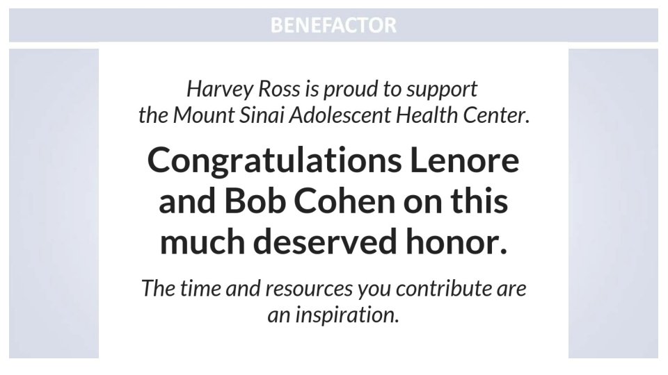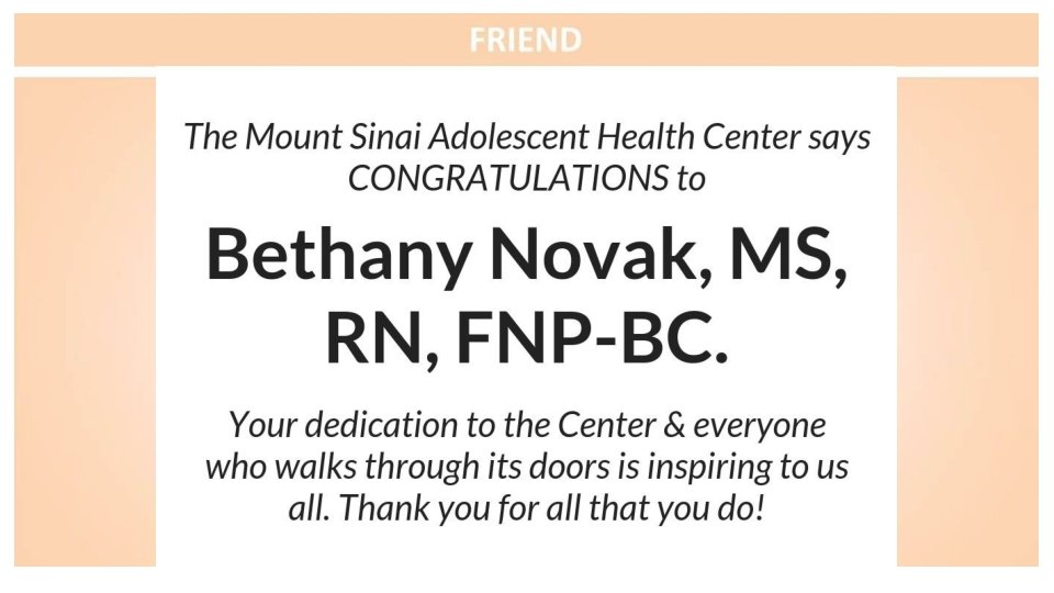 Congratulations to the Mount Sinai Adolescent Health Center on another fabulous year and to the sensational leadership of Dr. Angela Diaz Warmly, The Sacks Family