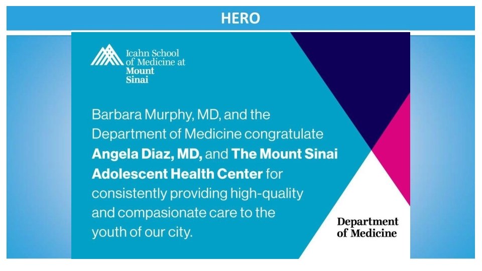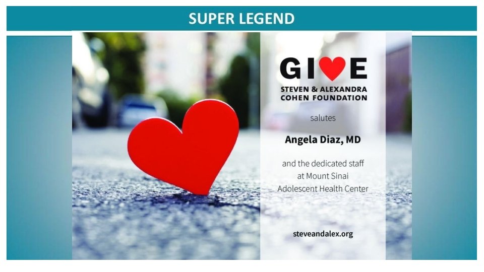 On behalf of Dr. Raja Flores and the Department of Thoracic Surgery we commend the work of Dr. Angela Diaz and the Adolescent Health Center Congratulations! Raja M. Flores, MD