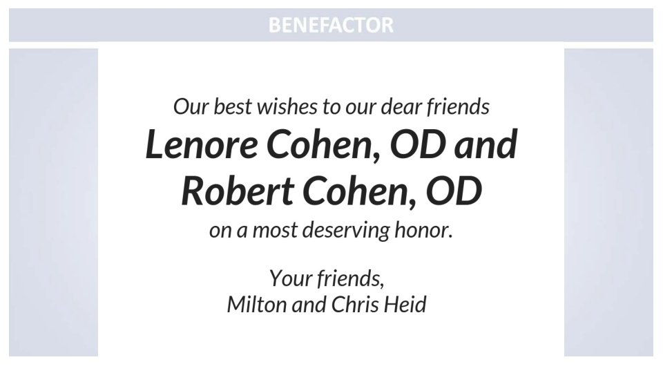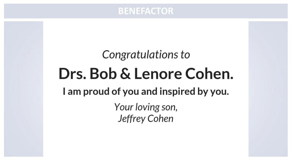 Congratulations to Drs. Bob and Lenore Cohen With love and appreciation, The families of Jane Ann Poblete, Mylene Vizarra and Sonny and Mayeth De Villa