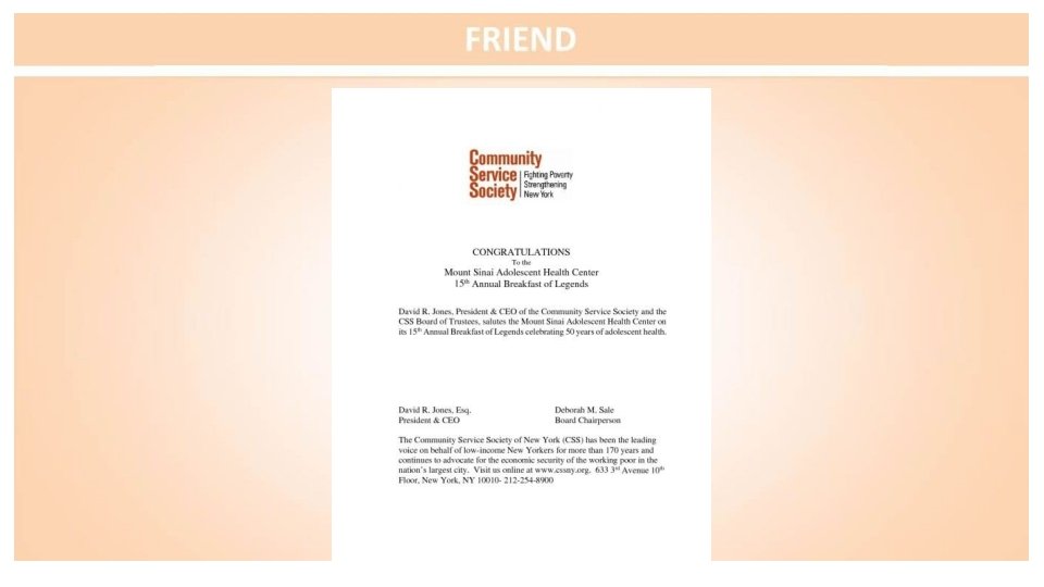 CONGRATULATIONS To the Mount Sinai Adolescent Health Center 15 th Annual Breakfast of Legends David R. Jones, President & CEO of the Community Service Society and the CSS Board of Trustees, salutes the Mount Sinai Adolescent Health Center on its 15 th Annual Breakfast of Legends. Congratulations to all the Honorees