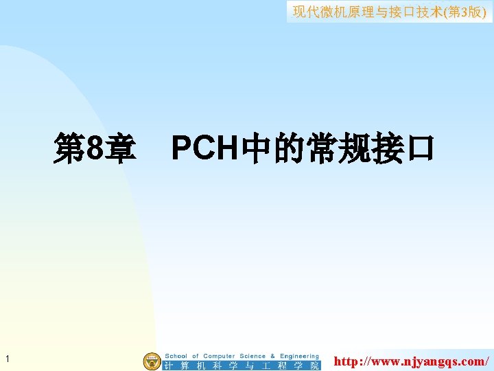 例: MOV AL,11010100 B 11 15 OUT 43 H,AL IN AL,41 H; MOV AH,AL IN AL,41 H XCHG AH,AL MOV AL,11011010 B 11 OUT 43 H,AL IN AL,40 H; MOV AH,AL IN AL,40 H XCHG AH,AL MOV BX,AX IN AL,42 H; MOV AH,AL IN AL,42 H XCHG AH,AL 现代微机原理与接口技术(第 3版) ; T/C 1, 锁存计数值 ;AX为当前计数值 ; T/C 0、T/C 2锁存计数值 ;AX为T/C 0当前计数值 ;BX为T/C 0当前计数值 ;AX为T/C 2当前计数值 http: //www. njyangqs. com/