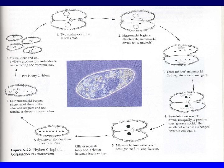 Ciliate life cycle • Life cycles include – Asexual binary fission – Conjugations (sexual): temporary union of two individuals for the function of exchanging genetic material