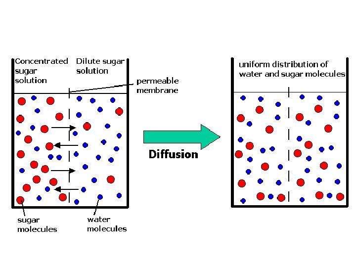 Factors Affecting Diffusion • Concentration—diffusion always goes from high concentration to low concetration • Temperature—the higher the temperature, the faster diffusion occurs • Molecular Size—the bigger the molecule, the longer diffusion takes