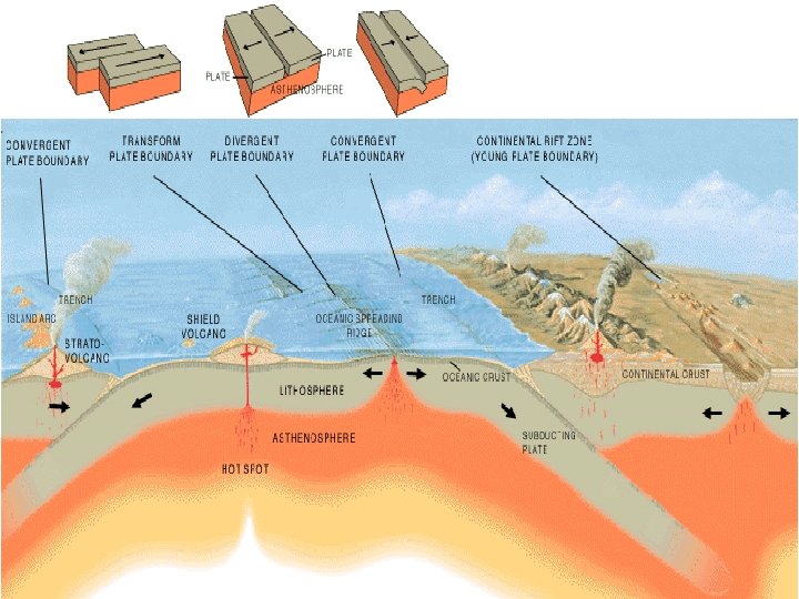Features Caused by Plate Tectonics • Mid-Ocean Ridges, Faults and Rift Valleys – formed at divergent boundaries where plates are pulled apart • Mountains and Volcanoes – formed at convergent boundaries where plates collide • Strike-Slip Faults- cause of earthquakes and are found at transform boundaries where plates grind past each other