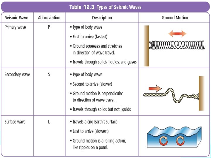 Types of Seismic Waves Surface Waves: • When P waves and S waves reach the surface, some of them become surface waves. • Surface waves move more slowly than P and S waves, but can produce more severe ground movements. • Some surface waves make the ground roll like ocean waves. Others shake buildings from side to side.