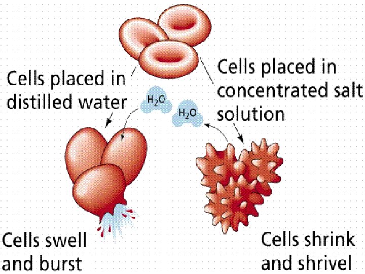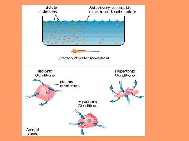 • Example: distilled water entering the cell • Water molecules diffuse from higher water concentrations to lower water concentrations • In solutions: higher concentration of solute, lower concentration of water; lower concentration of solute, higher concentration of water.