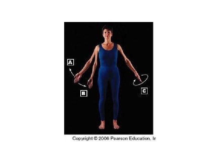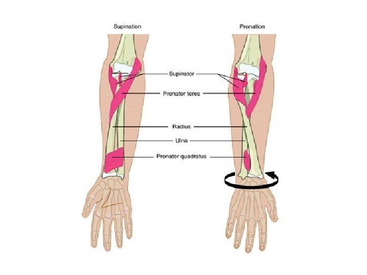 Types of Movements @ Synovial Joints • 8. supination/pronation • supination: movement of forearm in which palm is turned anteriorly • pronation: movement of forearm in which distal end of radius crosses over distal end ulna & palm is turned posteriorly
