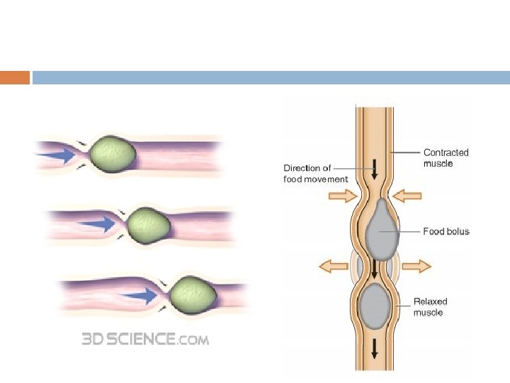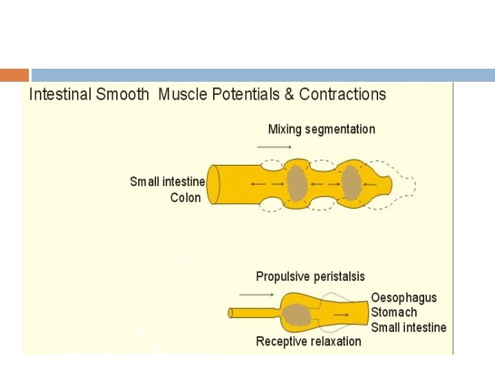 Peristaltic wave starts at any point of intestine and move anal ward at a velocity of 0. 5 to 2. 0 cm/sec Much faster in proximal intestine and much slower in terminal intestine Normally very weak and usually die after traveling 3 -5 cms , very rarely upto 10 cms So net movement along small intestine normally averages 1 cm/sec Thus it takes 3 -5 hours for passage of chyme from pylorus to ileocecal valve