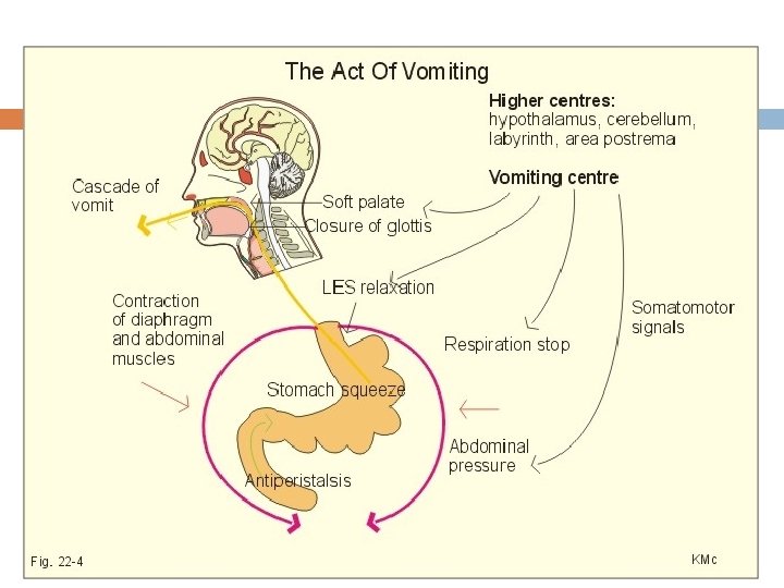 Anti peristalsis , the prelude to vomiting In early stages of gastrointestinal irritation Antiperistalsis begins to occur often many minutes before vomiting appears. Antiperistalsis starts in the ileum and travel backwards up the intestine at the rate of 2 - 3 cm/sec pushing large amount of intestinal contents back to duodenum and stomach within 3 -5 minutes Over distension of upper portion of GIT especially duodenum becomes the exciting factor that initiates actual vomiting act