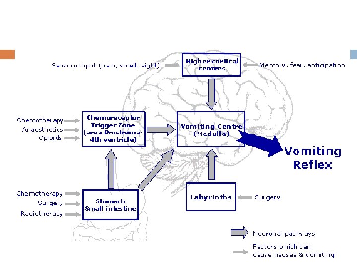 Causes: 1. 2. 3. 4. 5. 6. 7. 8. 9. 10. Presence of irritating contents of GIT Mechanical irritation of pharynx Pregnancy Excess alcohol Nauseating sight, odour or taste Unusual stimulation of Labyrinthine apparatus as in the case of sea sickness, air sickness, car sickness or swinging Drugs like antibiotics opiates Any GI disorder Acute infections like urinary tract infection Metabolic disturbances like carbohydrate starvation and ketosis