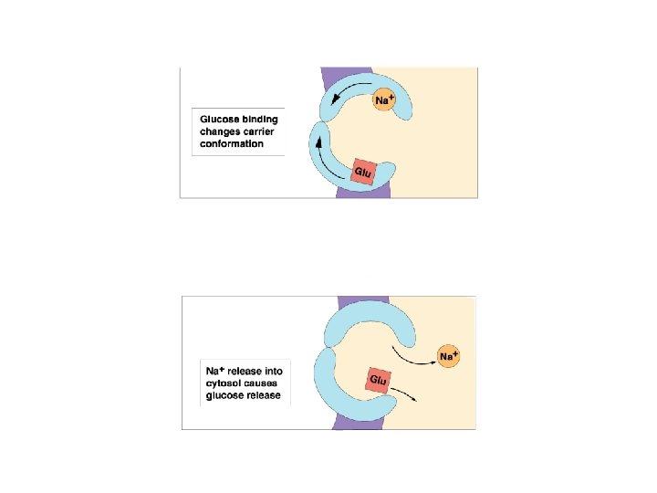 Simporte sódio-glicose Este transportador usa o potencial de energia do gradiente de [ ] do Na+ para transportar a glicose contra o seu gradiente de [ ]. Quando o carreador abre-se para o fluido extracelular, existe um sítio de ligação com alta afinidade pelo Na+ e um sítio com baixa afinidade pela glicose.